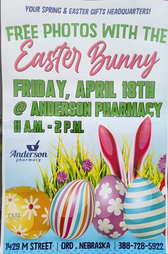 Anderson Pharmacy Easter Bunny The Easter Bunny will be at Anderson Pharmacy Set a Reminder Enter your email address below to receive a reminder message. Email address Select the amount of Days before the event -- Select Days Before Event -- 1 Day 2 Days 3 Days 1 Week Captcha Validation Please complete the Captcha Submit Date and Time Friday Apr 18, 2025 11:00 AM - 2:00 PM CDT Friday, April 18 11 am-2 pm Location Anderson Pharmacy 1429 M Street, Ord Set a Reminder Enter your email address below to receive a reminder message. Email address Select the amount of Days before the event -- Select Days Before Event -- 1 Day 2 Days 3 Days 1 Week Captcha Validation Please complete the Captcha Submit Share × Print Email Add to Calendar Facebook Twitter LinkedIn Tell a Friend × Select Calendar Type × Google Yahoo iCal (Outlook, Apple, or other)