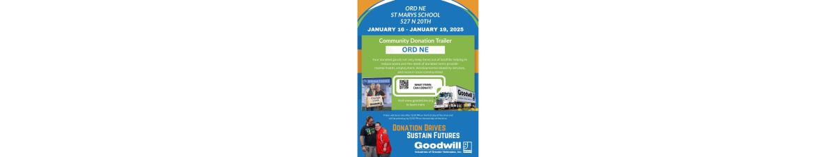 Goodwill Trailer in Ord The Goodwill Trailer will be in Ord January 16-19, 2026. Please place all items inside the trailer. Items on the steps or outside the trailer will NOT be accepted. Set a Reminder Enter your email address below to receive a reminder message. Email address Select the amount of Days before the event -- Select Days Before Event -- 1 Day 2 Days 3 Days 1 Week Captcha Validation Please complete the Captcha Submit Date and Time Friday Jan 16, 2026 Monday Jan 19, 2026 January 16-19, 2026 Location 527 N 20th Street Ord, NE Set a Reminder Enter your email address below to receive a reminder message. Email address Select the amount of Days before the event -- Select Days Before Event -- 1 Day 2 Days 3 Days 1 Week Captcha Validation Please complete the Captcha Submit Share × Print Email Add to Calendar Facebook Twitter LinkedIn Tell a Friend × Select Calendar Type × Google Yahoo iCal (Outlook, Apple, or other)