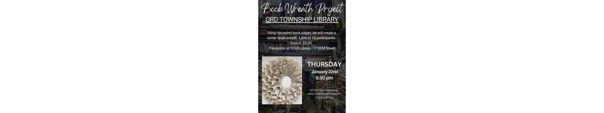 Join Ord Township Library for Making Book Wreaths on Thursday, January 22, 2026 at 5:30 PM. Cost is $5 per person, pre-registration required.