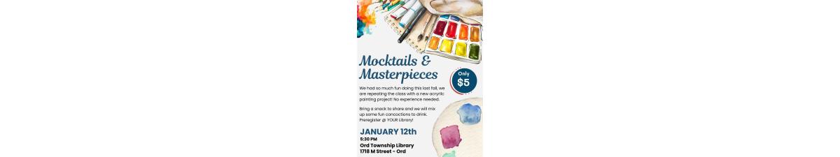 Join Ord Township Library for Mocktails & Masterpieces on Monday, January 12th at 5:30 PM. $5 per person, plus snacks to share. Pre-registration is required at Ord Township Library.