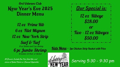The Vet's Club is the place to be on New Year's Eve! Dinner will be served starting at 5:30 pm. Prime rib, filet mignon, surf & turf, and so much more.
