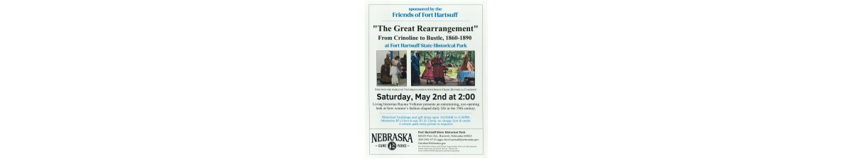 Join Fort Hartsuff State Historical Park for The Great Rearrangement: From Crinoline to Bustle, 1860-1890 on Saturday, May 2, 2026 at 2 PM. Step into the world of victorian fashion with Indian Creek Historical Fashions. Living historian Rayma Volkmer presents and entertaining, eye-opening look at how women's fashion shaped daily life in the 19th century.